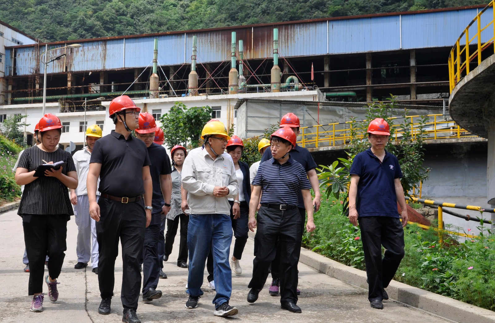 陕西华源矿业公司位于陕西省商南县过风楼镇,是一家集石煤型钒矿开发、加工及销售为一体的大型矿业公司。熊良虎首先实地查看了研磨浸出车间、离子交换车间、沉钒车间与污水处理车间,认真询问了矿石品位,细致了解了工艺情况,并就固液分离、树脂吸附、解析除杂,下游产品研发以及尾矿废渣无害化处理等工艺环节与技术问题同技术人员进行深入交流。