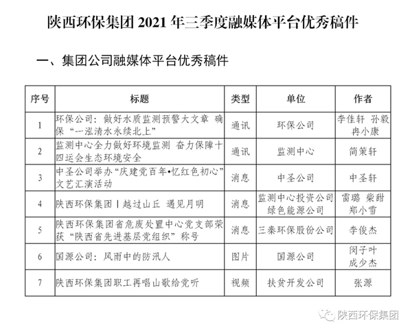 为加强集团公司门户网站、微信公众号、新浪微博等融媒体平台的稿件采编工作,鼓励广大通讯员围绕企业中心工作撰写出高质量的稿件,发挥优秀稿件的示范作用,为集团高质量发展鼓与呼,按照集团公司《关于建立政务信息采用情况通报和优秀稿件评选制度的通知》(陕环司函〔2021〕31号)文件要求,现将2021年三季度集团公司融媒体平台稿件采用及优秀稿件评选情况通报如下: