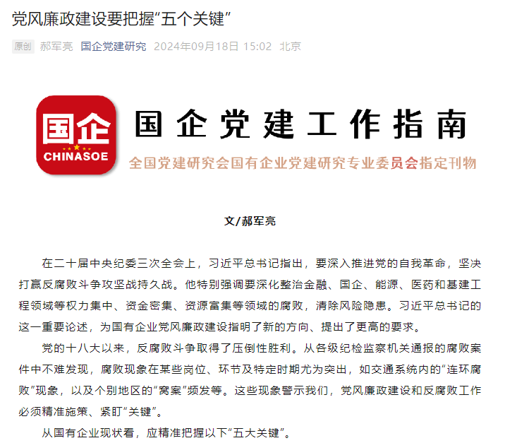 在二十届中央纪委三次全会上,习近平总书记指出,要深入推进党的自我革命,坚决打赢反腐败斗争攻坚战持久战。他特别强调要深化整治金融、国企、能源、医药和基建工程领域等权力集中、资金密集、资源富集等领域的腐败,清除风险隐患。习近平总书记的这一重要论述,为国有企业党风廉政建设指明了新的方向、提出了更高的要求。
