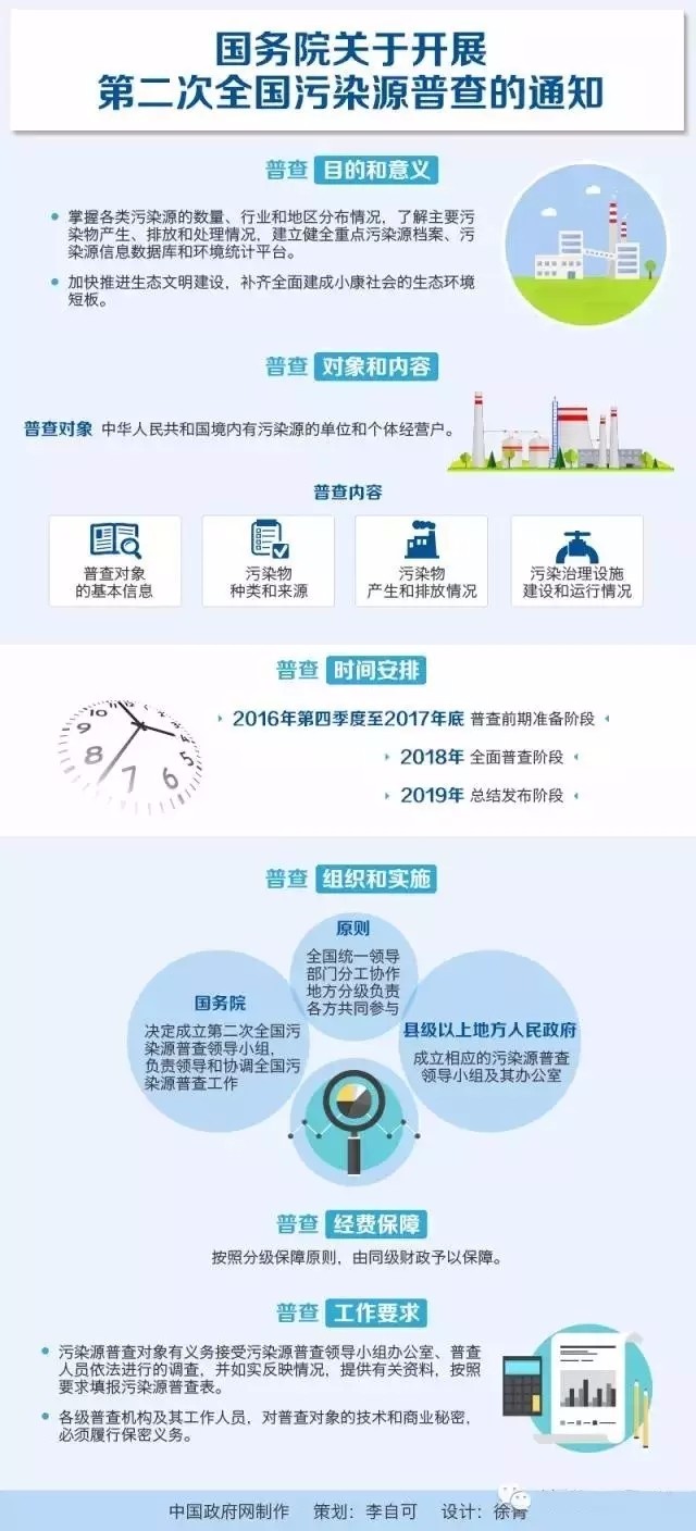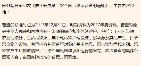 全国污染源普查是重大的国情调查,是环境保护的基础性工作。开展第二次全国污染源普查,掌握各类污染源的数量、行业和地区分布情况,了解主要污染物产生、排放和处理情况,建立健全重点污染源档案、污染源信息数据库和环境统计平台,对于准确判断我国当前环境形势,制定实施有针对性的经济社会发展和环境保护政策、规划,不断改善环境质量,加快推进生态文明建设,补齐全面建成小康社会的生态环境短板具有重要意义。