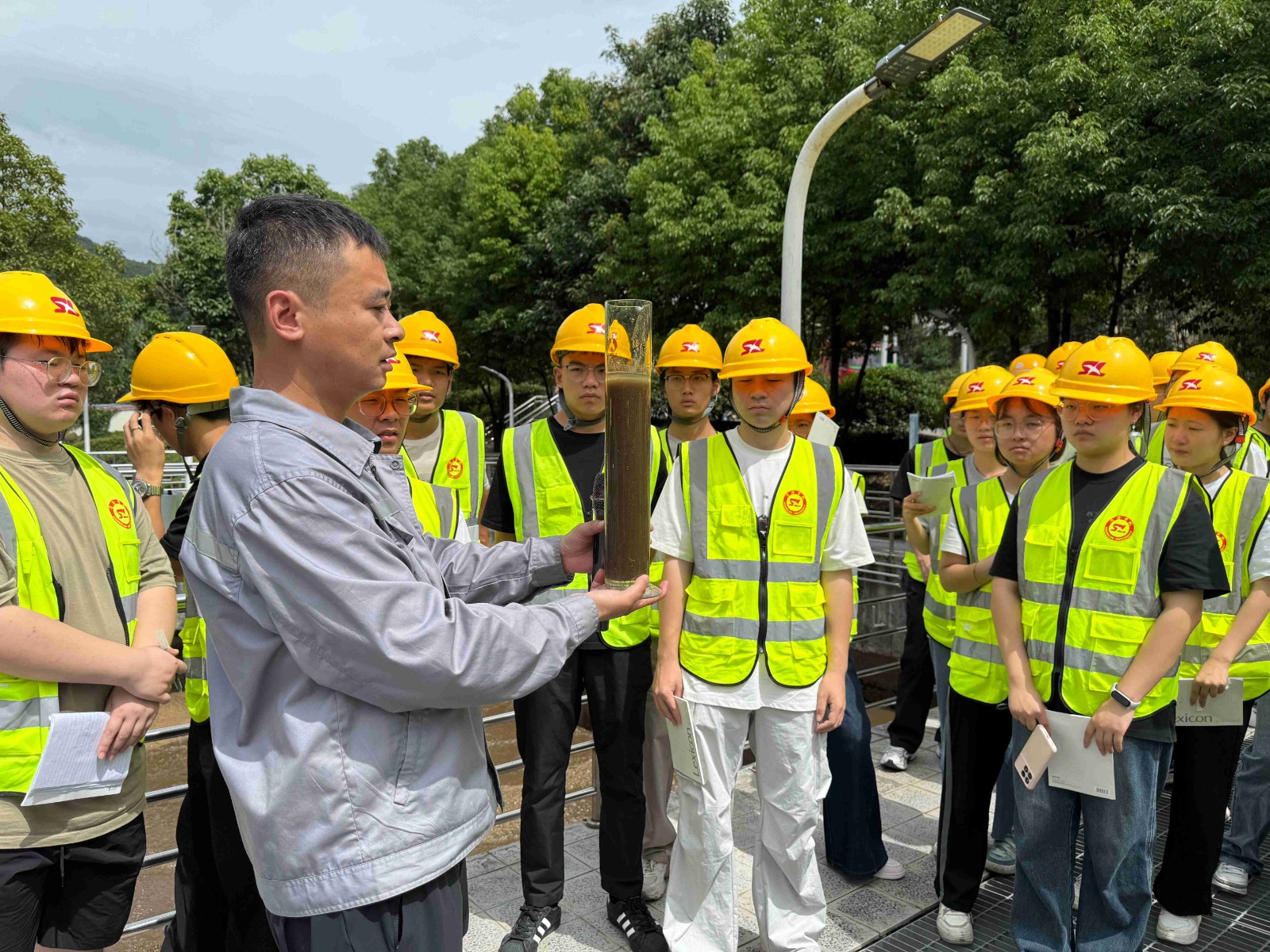 活动现场,工作人员首先向师生们介绍了污水处理厂的概况及运行情况,随后,带领大家依次参观细格栅、生化池、消毒池、出水口等污水处理设施,系统讲解污水从收集、处理到达标排放的全流程工艺。在互动问答环节中,现场工作人员针对污泥处置、水质监测等问题进行专业讲解,并通过现场陈列处理前后的水样对比,让师生们直观见证污水处理成效,深化环保知识认知。