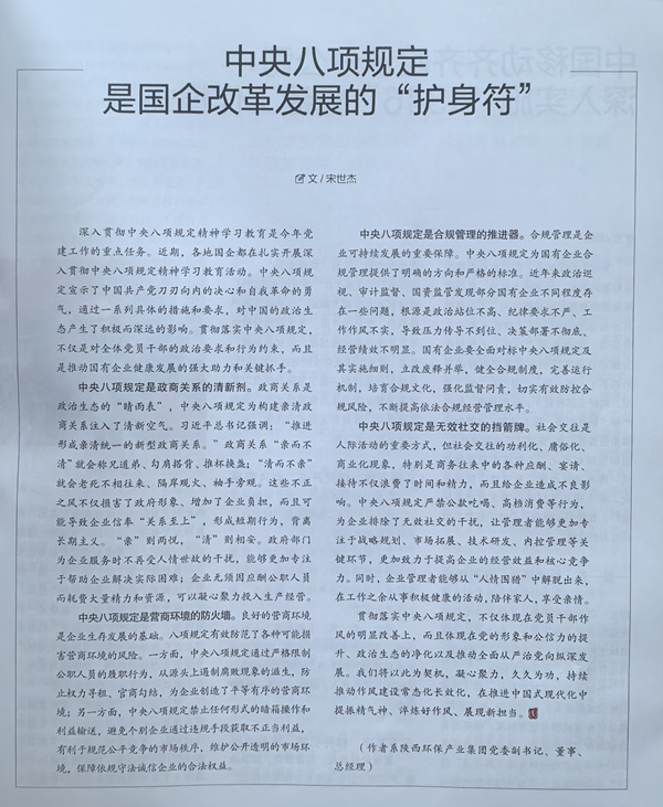日前出版的《国企》杂志刊发了威廉希尓指数500集团党委副书记、董事、总经理宋世杰同志文章《中央八项规定是国企改革发展的“护身符”》。现刊载如下,以飨读者。