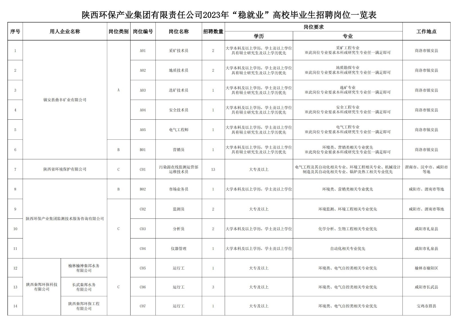 (二)岗位类别 本次招聘3个类别岗位: 1.A类:专业技术类岗位 2.B类:市场营销类岗位 3.C类:技能操作类岗位 (三)招聘岗位及任职条件: 招聘岗位及任职条件详见附件;部分岗位须与用人企业约定同类型岗位服务年限。 三、招聘程序 本次社会公开招聘按照发布招聘公告→报名及资格初审→笔试→现场资格复审→面试→体检→公示及录用等程序进行。 (一)发布招聘公告 2.智联招聘西安频道(http://www.zhaopin.com/xian) 3.陕西公共招聘网(http://www.sxggzp.com/) (二)报名及资格初审 1.公告发布及报名时间:2023年8月18日14:00-2023年8月23日 17:00 2.报名网站:https://sxhbjtzp.zhaopin.com 3.报名方式: (1)本次招聘采取线上报名及资格初审方式,不设现场报名,不接受简历邮递、面呈等方式。 (2)应聘人员须根据报名系统要求仔细填写信息,上传相应材料,避免因个人原因导致报名不成功。 4.应聘人员在报名系统中须正确上传所需资料,具体如下: (1)本人近期免冠正面证件照; (2)身份证正反面或其他有效身份证件扫描件; (3)所有学历证、学位证原件电子版(国(境)外学历须上传教育部留学服务中心认证的《国内外学历学位认证书》); (4)招聘岗位任职条件要求的其他证明材料扫描件。 5.A类岗位原则上采用笔试与面试相结合的方式进行考核;B类、C类岗位原则上采用面试方式进行考核,具体考核方式以实际情况为准。 6.其他要求: (1)资格初审上传资料与填报的报名信息须保持一致,若其中一项不符合报考岗位所需要求,视为线上资格初审不通过; (2)应聘人员相关材料必须真实可靠。因报名提交资料不真实、不完整或错误遗漏,造成报名无效、资格初审及后续资格审查不通过等后果的,由应聘人员自行承担责任; (3)为确保报名成功,建议应聘人员在PC(电脑)端进行报名操作; (4)资格初审结果不作为确定符合岗位条件的最终依据,资格审查贯穿招聘工作全过程。凡在招聘工作各个环节中发现报考者不符合岗位条件或存在弄虚作假等问题的,一经查实,取消报考(录用)资格,已经录用的解除劳动合同并追究相关法律责任。 (三)笔试 1.通过资格初审的应聘人员,进入笔试环节; 2.笔试主要考核应聘者综合素质; 3.笔试时间、地点另行通知; 4.应聘人员须在指定时间内登录报名网站下载打印准考证,未按时打印准考证者视为主动放弃。 (四)现场资格复审 根据笔试成绩排名,确定进入资格复审环节的应聘人员,招聘企业现场对所提交的资料真实性进行核验。 (五)面试 1.通过资格复审的应聘人员,进入面试环节; 2.面试主要考核应聘者专业素质; 3.面试时间、地点另行通知; 4.面试结束后,根据综合成绩从高到低确定拟录用人员。 (六)公示 对拟录用人员进行公示。 (七)体检 公示结束后,各用人企业组织拟录用人员进行体检,体检费用由拟录用人员自理。体检不合格的,取消应聘资格。 (八)递补 如出现应聘人员未参加体检、体检不合格、放弃录用等情况,由招聘企业决定是否递补。 (九)录用 对体检合格的拟录用人员按有关规定办理录用手续。 四、注意事项 (一)应聘者应对本人所填报资料的真实性负责,诚实应聘。对伪造、涂改证件证明,或以其他不正当手段获取应聘资格、在考核过程中作弊等违反公开招聘纪律的应聘人员,将取消应聘资格,对已录用人员,一经查实,即予解除劳动关系。 (二)本次招聘不指定教材和辅导用书,不举办也不委托任何机构和个人举办考试辅导培训班。 (三)应聘人员报名时须提交能及时联系到本人的电话号码,以便在出现递补情形时联系本人。因个人原因无法取得联系造成的后果,由个人自行负责。应聘人员报名成功后,请时刻关注公告发布网站上的有关资格复审、考试及其它相关信息,以免错过时间节点。